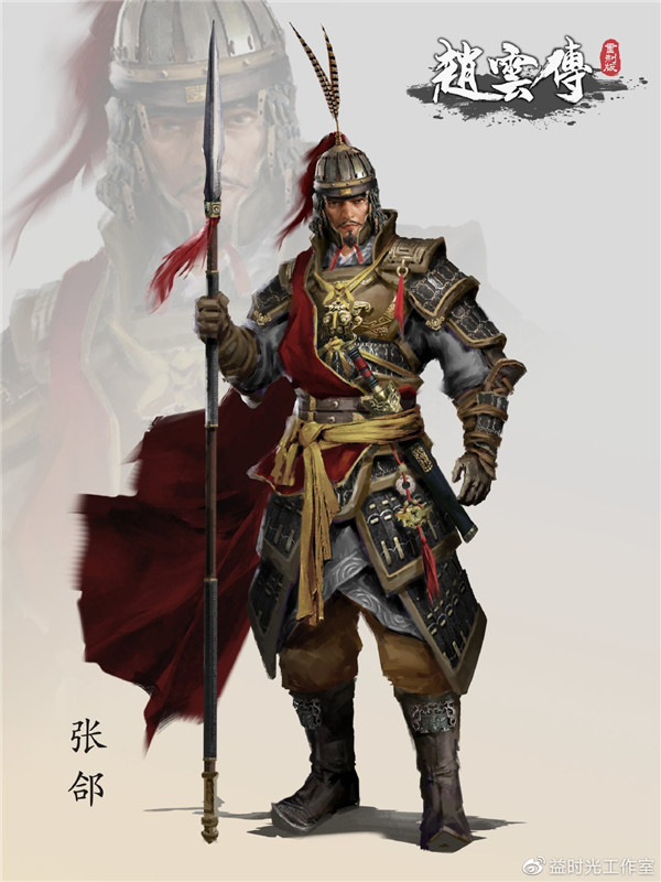 张郃同样是袁绍旧将,在官渡之战后投降曹操,在曹操阵营中屡建奇功,直至三国后期战死在魏蜀战场。张郃在袁绍阵营发迹,成名于曹操阵营,作为曹军大将与赵云在新野大战中多次遭遇。张郃无论是用兵还是做人,均善估形势而巧变,正因为此个性,其在曹营中得委以重任。《赵云传重制版》中,张郃的原画形象貌然站立,形象持重,冷静而不动声色,气息肃杀,以体现张郃冷静的性格。