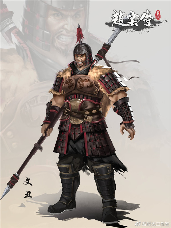 文丑是东汉末期袁绍部下的武将,素有威名,文丑与颜良一起作为袁绍军队的勇将而闻名。作为袁军的主力战将,文丑在袁绍与公孙瓒的战斗中一直充当先锋,所以与公孙瓒麾下的赵云多次交战。文丑人物形象史无记载,在《赵云传重制版》中以重甲武将示人,武器为利刃长枪,面部形象凶暴,体现冲在锋线“一言不合就砍人”勇夫形象。