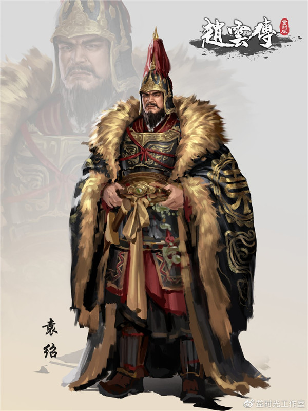袁绍家族显赫、四世三公,袁本初在史实及演义中均有仪表非凡的记载,在《赵云传重制版》中袁绍的原画形象较为英武,顺应三国时代对于男性魁梧的审美认知、褐黄主色调凸显人物的家世显赫,形象动作体现威严自信,暗示袁绍刚愎自付、不听劝谏的性格,也正是这样的性格导致了袁本初最终失败。