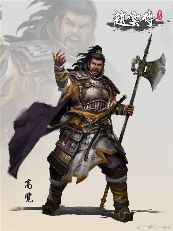 高览是袁绍旧将,在官渡之战后投降曹操,在《三国演义》中曾与许褚、徐晃大战不分胜负,武力高强。刘备败走荆州时,高览奉命追杀,被赵云长枪刺死于马下。高览个人武力值超群,《赵云传重制版》中高览原画设定手持巨型斧钺,凸显强大的武力压迫,面部表情挥洒狂嗥,以体现高战力武将的得意与霸气。