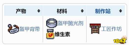 制作:1个盔甲抛光剂和1个维生素,在工匠作坊可以合成1个盔甲背带。